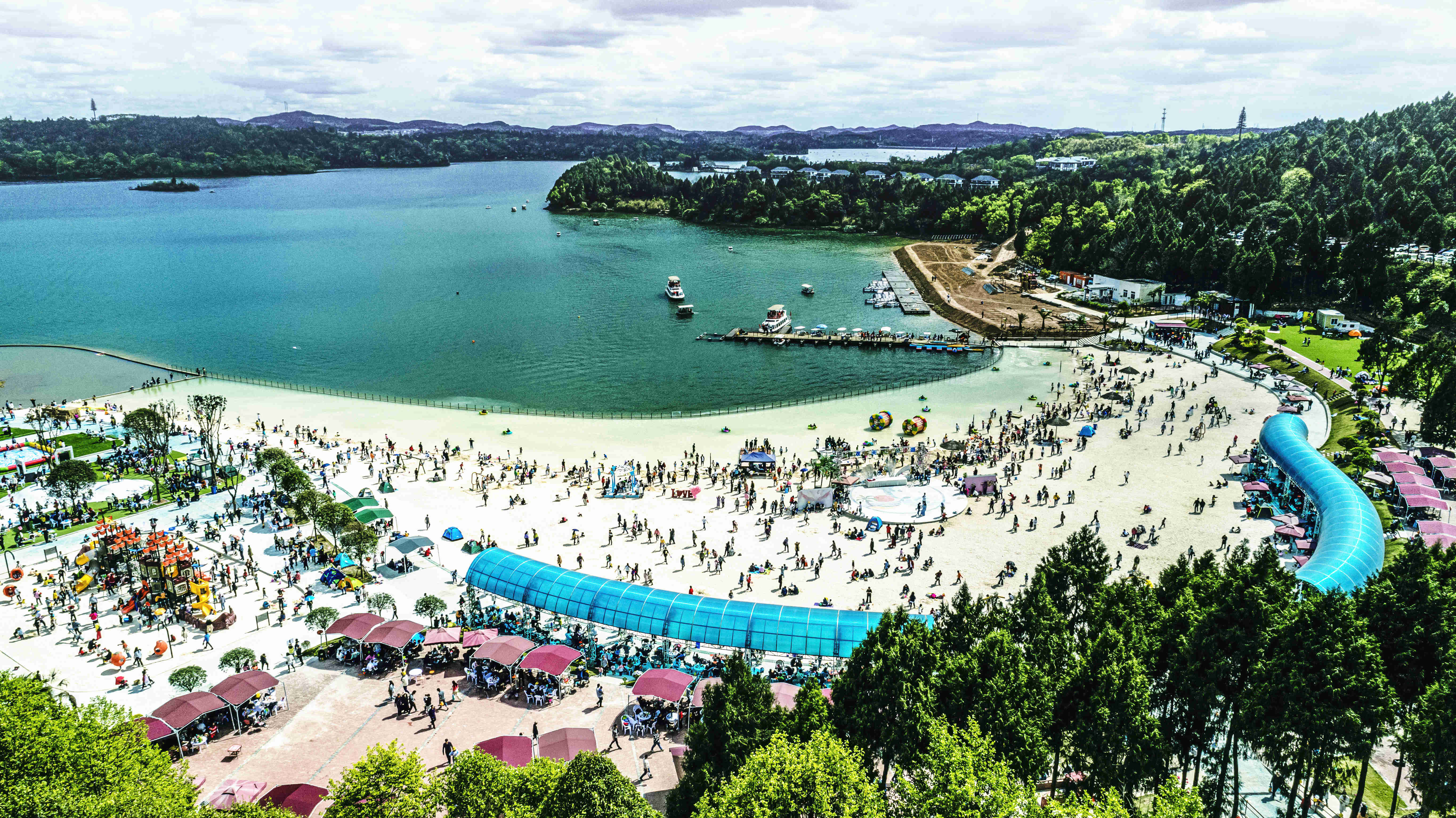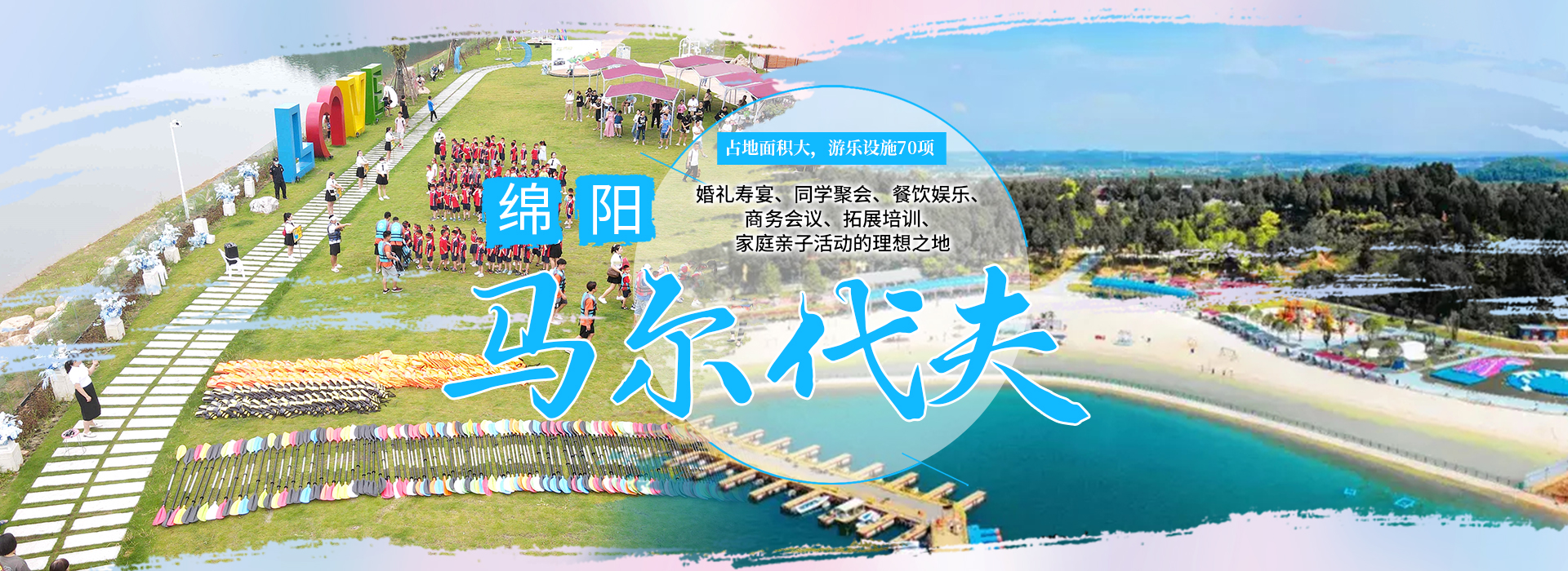 綿陽嘉成文化旅游有限公司是一家旅游開發(fā)公司,成立于2019年。 親水灣沙灘樂園項目由綿陽嘉成文化旅游有限公司開發(fā)運營,位于國家級水利風景區(qū)——綿陽市仙海水利風景區(qū),距綿陽市區(qū)15公里,車程約半個小時,是依托沉抗水庫建設的仙海風景區(qū)重點旅游項目。進入仙海風景區(qū)上坡向左進入環(huán)湖路前行1000米。項目總占地220畝,其中核心沙灘樂園占地100畝,現(xiàn)建成沙灘休閑、淺灘嬉水、水上運動,親子蹦蹦云、網(wǎng)紅多人秋千、人力過山車、水幕秋千、團隊拓展等項目十余個,還開設有特色中餐、仙海火鍋魚,自助燒烤等飲食項目。 近觀青山綠水,遠眺碧波蕩漾,清晨朝霞映翠、傍晚水天一色。親水灣沙灘主題樂園有可容納200人的沙灘會議室和30人的小型會議室;棋牌室16間; 商務KTV;餐飲中心可同時容納300人用餐;篝火晚會場地等,是婚禮壽宴、同學聚會、餐飲娛樂、商務會議、拓展培訓、家庭親子活動的首選之地。
